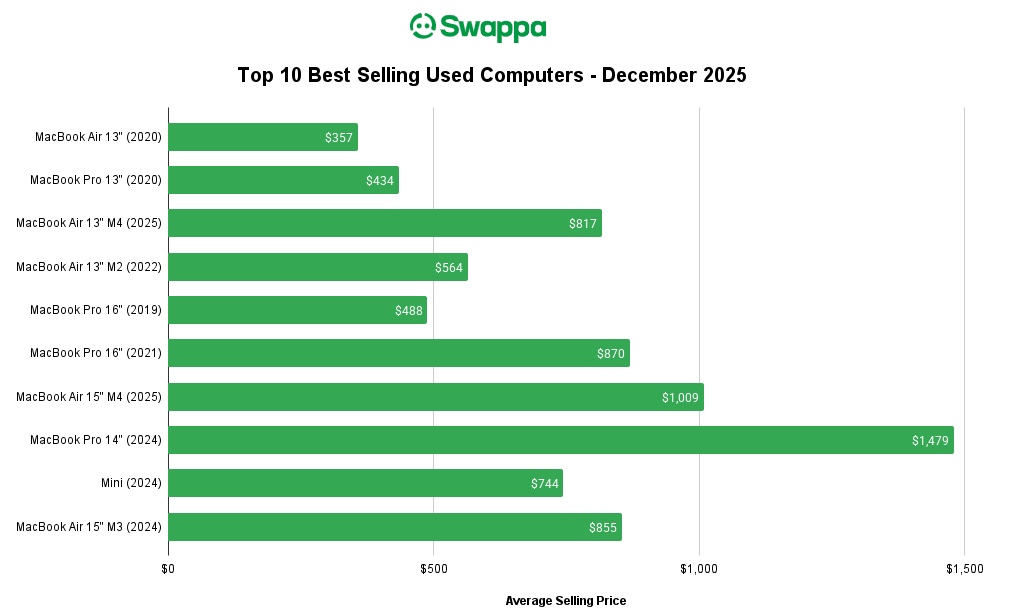 The best-selling computer sold on Swappa in December 2025 was the 13″ 2020 MacBook Air: