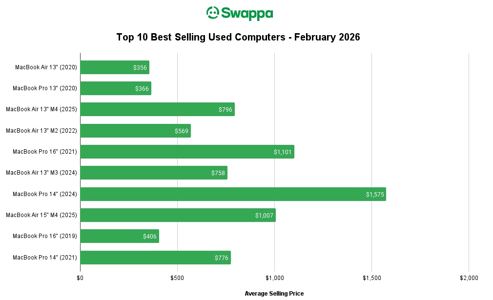 The best-selling computer sold on Swappa in February 2026 was the 13″ 2020 MacBook Air: