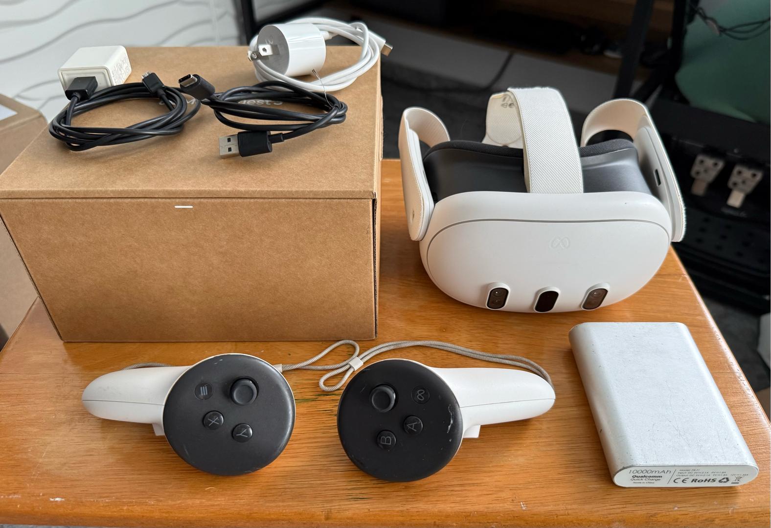 Selling a Meta Quest 3. The headset is in excellent condition with mint lenses. I will be including the controller straps, the original USB charger cable and wall plug, and original box/paperwork. As a bonus, I will be including an additional Apple 20w wall plug and USB cable and one Aukey 10,000mAh portable battery.