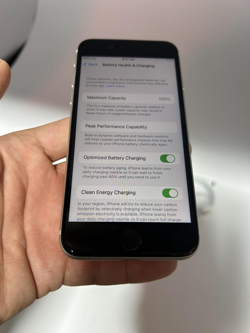 El iPhone SE (2022) tiene una batería recargable de iones de litio de 2,018 mAh que ofrece hasta 15 horas de tiempo de reproducción de video y hasta 50 horas de tiempo de reproducción de audio. El teléfono es compatible con carga rápida, cargando hasta el 50% en 30 minutos usando el adaptador de corriente de 20W de Apple. El iPhone SE (2022) se carga usando un cable Lightning y de forma inalámbrica usando el estándar de carga inalámbrica Qi.