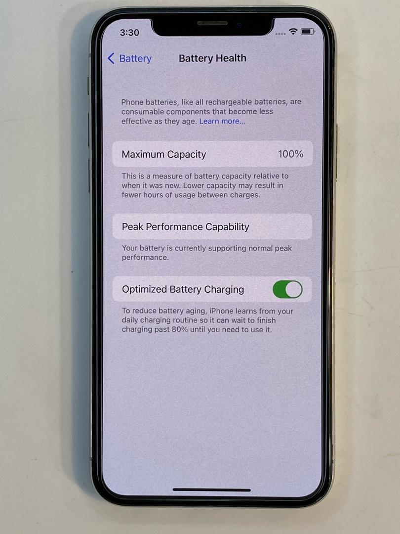 The iPhone X features a 2,716 mAh rechargeable lithium-ion battery. Battery life estimates for the iPhone X include up to 13 hours of video playback time and up to 60 hours of audio playback time. The smartphone is fast-charge capable and can reach a 50% charge in 30 minutes using an Apple 20W power adapter. Charging options include a Lightning cable or wirelessly using a Qi wireless charging pad.