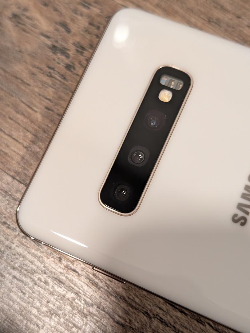 The rear camera on the Galaxy S10+ is a triple array with dual optical image stabilization. The array includes a 12MP telephoto, 12MP wide-angle, and 16MP ultrawide lens. The front camera is a dual-camera setup with a dual-pixel 10MP selfie camera and an 8MP RGB depth camera. The Galaxy S10+ supports HDR 10+ and HEVC (High-Efficiency Video Coding) and can record 4K or 1080p video at up to 60 frames per second. Some of the key camera features include Single Take, Live Focus, and Night Mode.