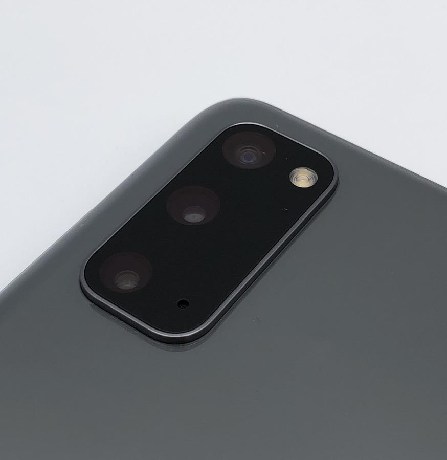 The Galaxy S20 5G features a hole-punch style 10MP selfie camera on the front, and a triple camera array on the back with a 12MP ultra-wide, 12MP wide-angle, and 64MP telephoto lens. The front-facing camera is dual pixel autofocus with an f/2.2 aperture and an 80-degree field of view. The ultra-wide rear camera features a 120-degree field of view, and key features of the rear camera array include Space Zoom, OIS (optical image stabilization), Scene Optimizer, Shot Suggestions, and Flaw Detection.