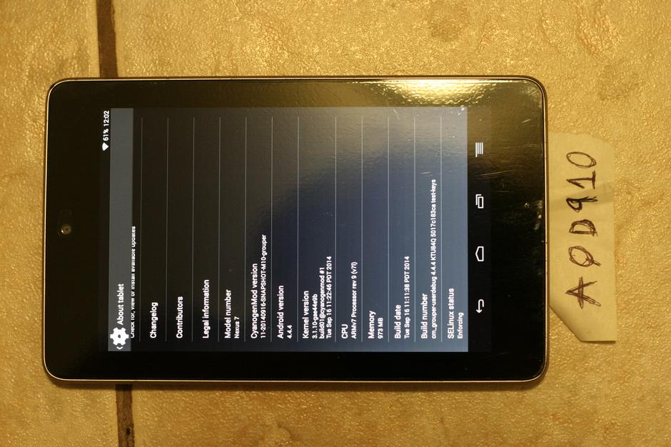 I think this might be the most well-cared-for device I have ever owned, babied its whole life. First generation Nexus 7, 16GB model, wifi only, running Cyanogenmod 11 M10. Makes a great medium-sized tablet.
