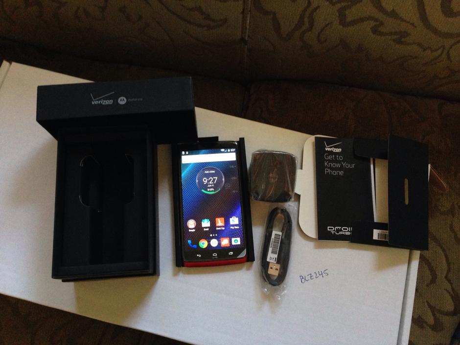 Brand new Droid Turbo, comes with all original packaging AND original protective stickers. Full working condition, no dings, scratches or cosmetic problems. Received as a replacement for a stolen phone that I had just finished paying off, and I was switching carriers.