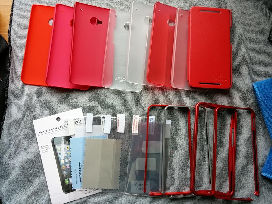 Includes Nillkin flip case, 3 clear minimalist snap on cases, 4 aluminum bumper cases, 4 red minimalist snap on cases, 2 mirrored screen protectors, 5 clear screen protectors. Also has a red carbon fiber skin on the back (remove easily if you do not like it). Original charger (never used) and box.
