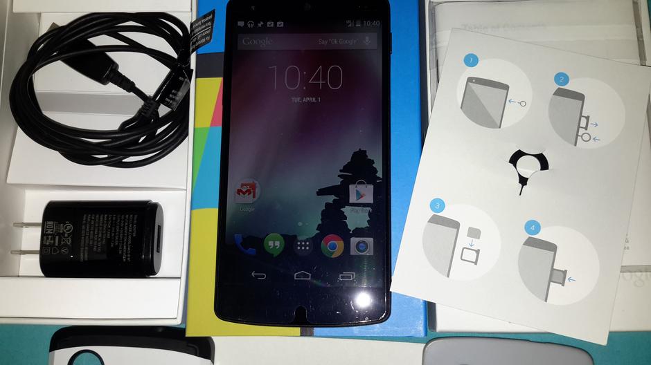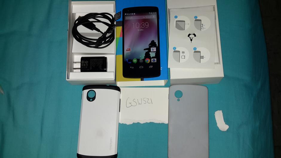 Mint Nexus 5, Unlocked, screen protector on the phone, box, two cases, and charger