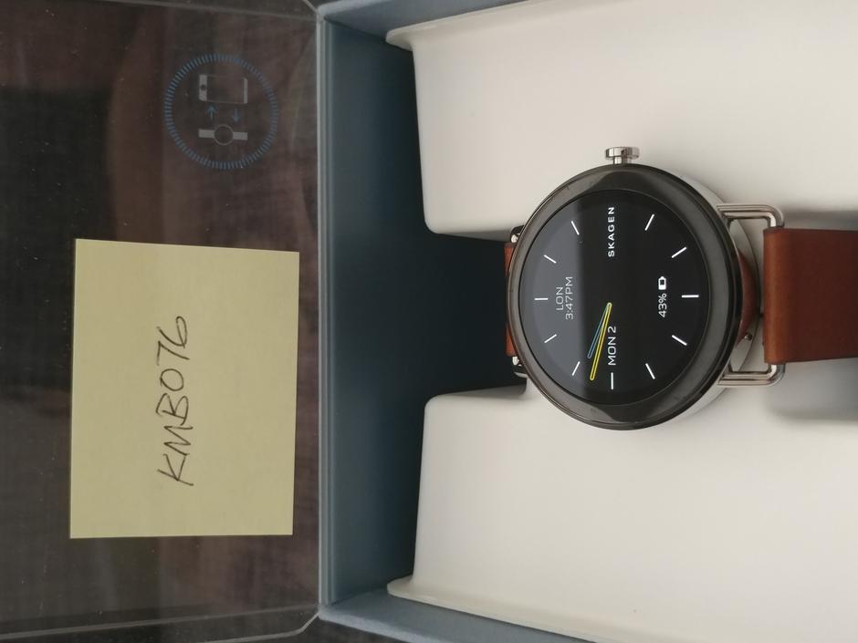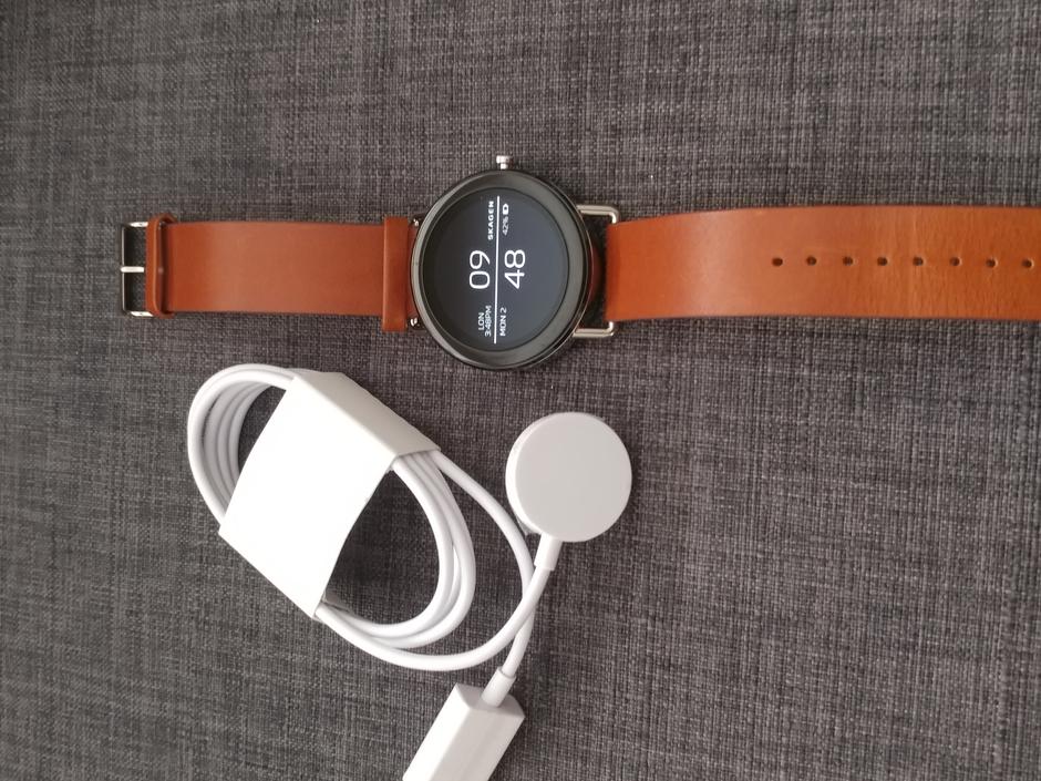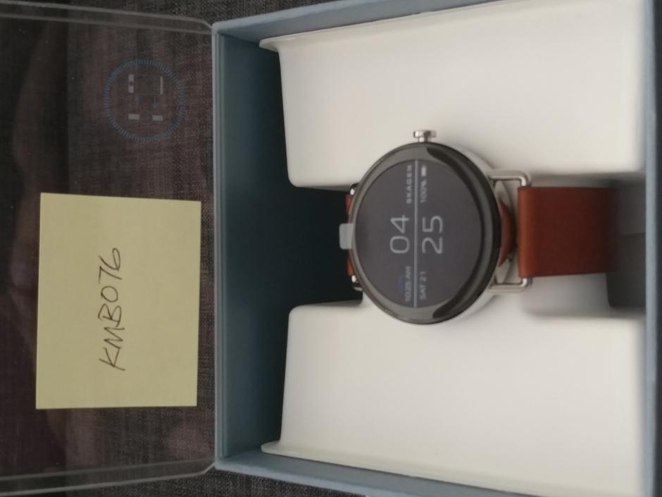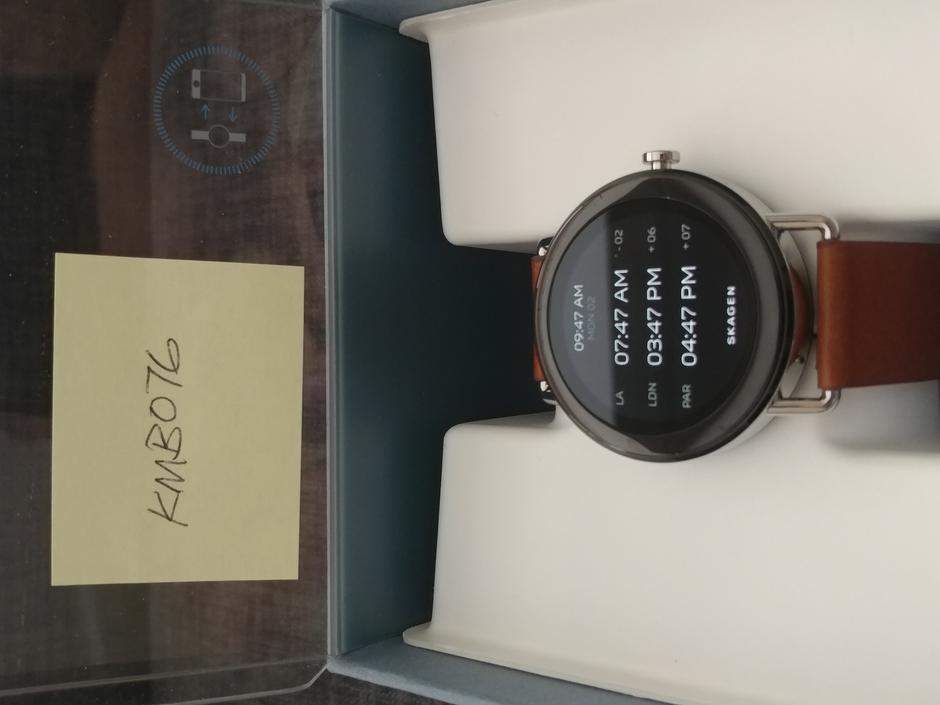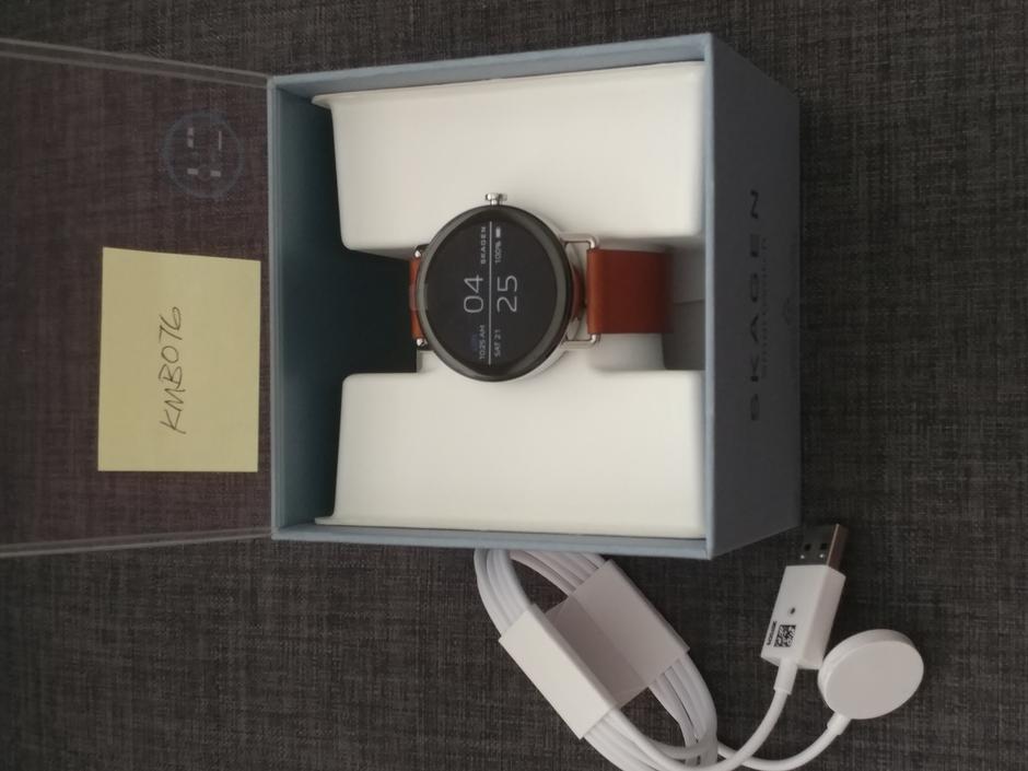 Opened but decided not to keep. Little to no signs of wear on the watch and leather band. Charger is unused. Very elegant, minimalist design that only Skagen can offer.