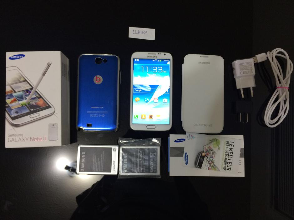 This Note II has absolutely no scratches on the screen. Silver frame around the phone shows minor wear from normal use. Comes with all original accessories including, retail box, original charger and cable, original white flip cover, and another case with monster beats logo.