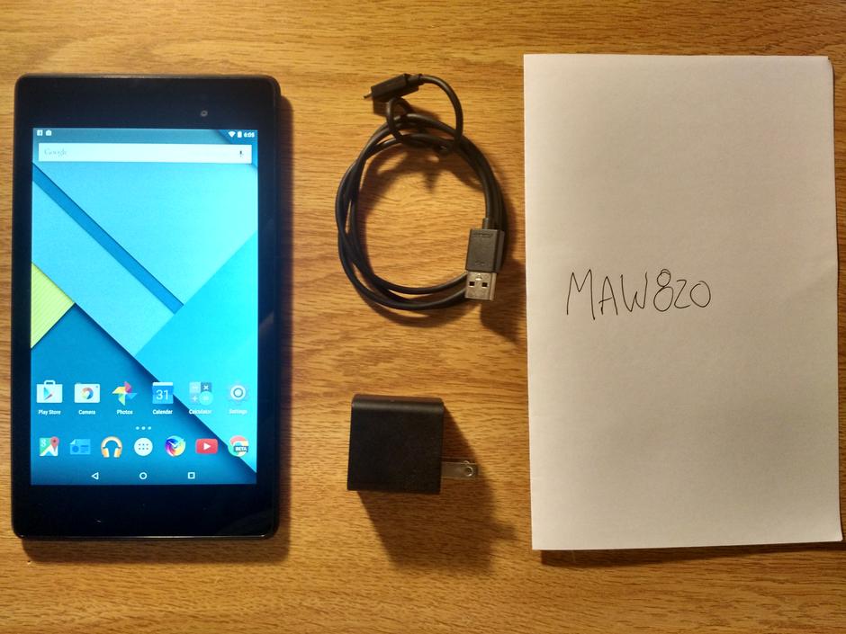 Looks new. Fast Shipping. Unlocked bootloader. Stock Lollipop not rooted. Comes with Usb cable, wall plug, bluetooth keyboard, and slimport hdmi out
