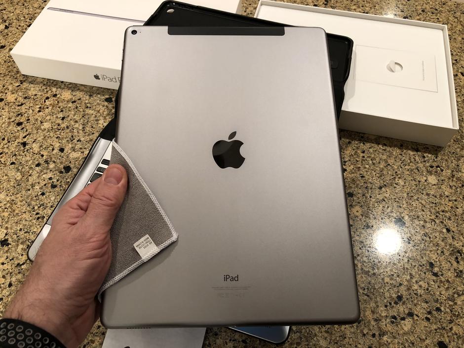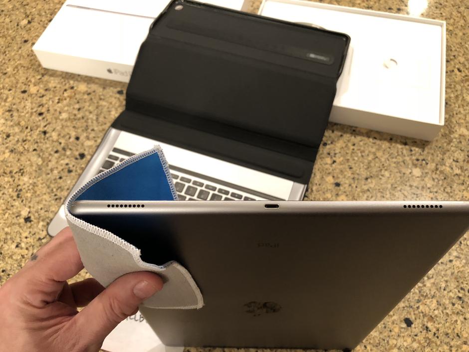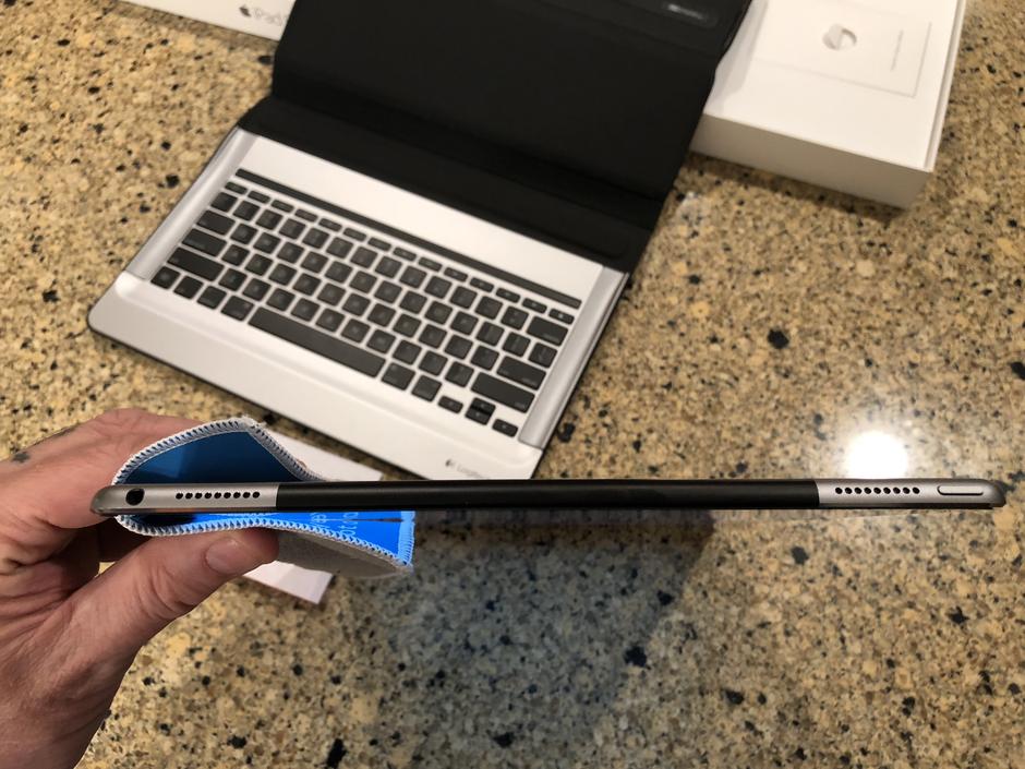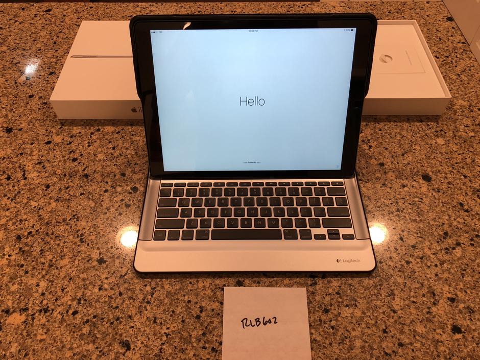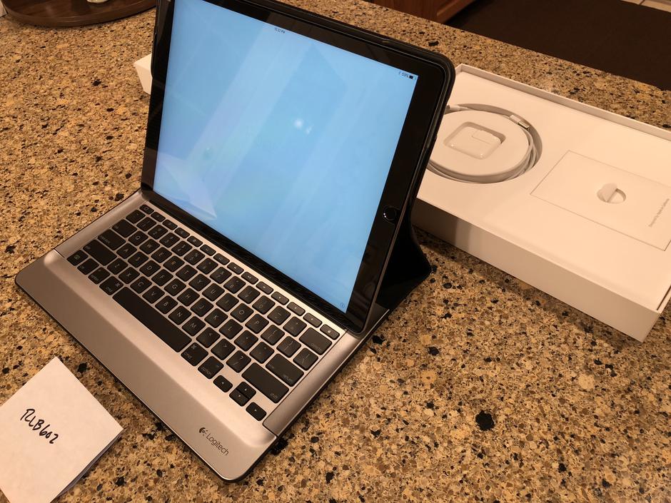 Includes original box, Apple charger, Apple cord, NEW and installed tempered glass screen protector and NEW $150 Logitech keyboard! I bought this keyboard from a business that had purchased several of them and then never used them. Flawless, new condition (no box though.) It’s aluminum frame offers great protection and it’s great for when you have to get some serious work done! The keyboard is ‘smart’ because it never needs paired or charged. It gets all of it’s power and data from smart connectors on the side of the iPad. It’s also backlit!