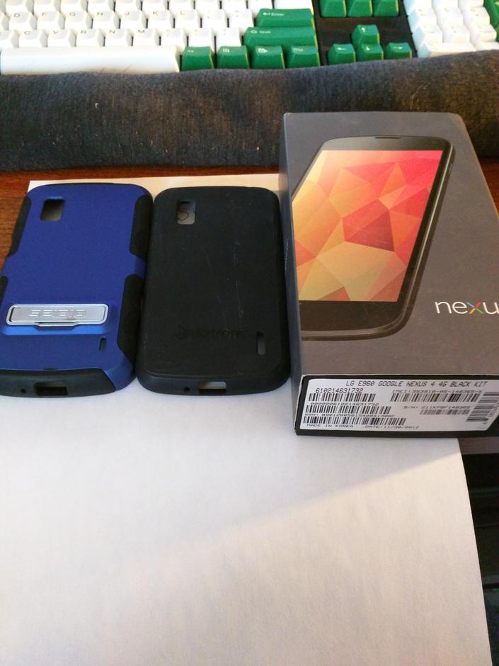 Up for sale, I have my Nexus 4. This device is in great shape and only has one noticeable ding (pictured). The back is in excellent shape, as I had a protector on it (removed for sale) since it was new. This will come with a Seidio DILEX case (black and Blue) and a Black Diztronic case. Will also include an AC charger, but I do not have a cable to send.