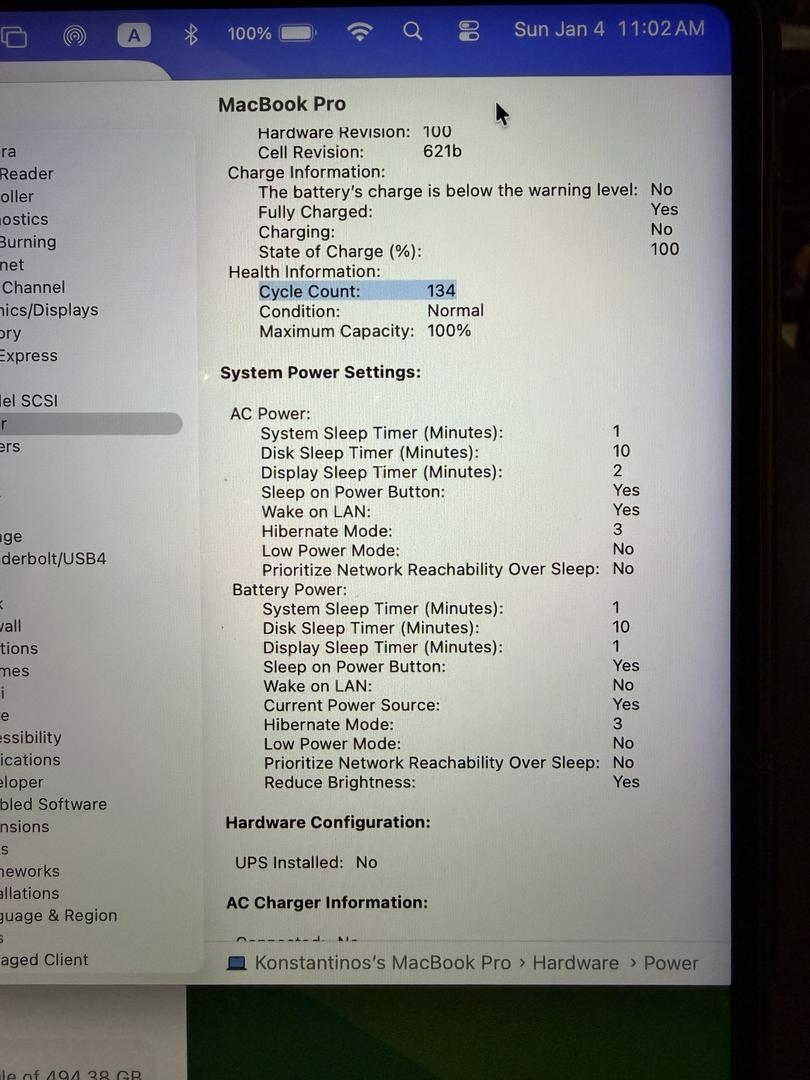 • Battery cycle count: 134 (Apple rated for ~1,000 cycles)