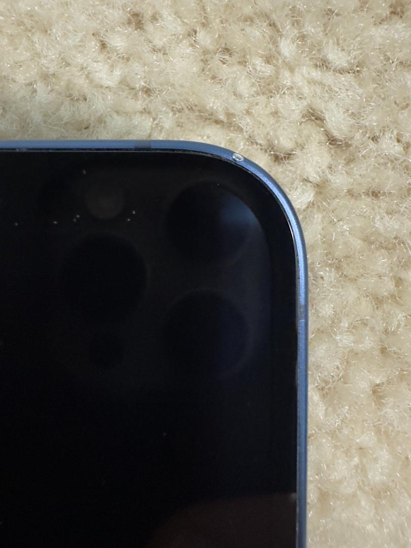 Small scratch/dent on the front top right edge. Slight discoloration on the camera lenses borders. Pictures of wear/tear attached.