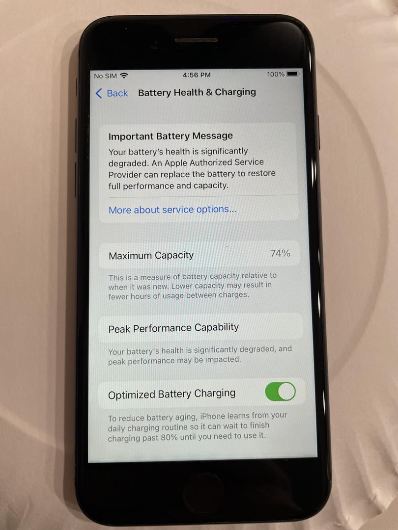 Battery Health: 74%, Battery holds charge but is below 80%, which is reflected in the price.