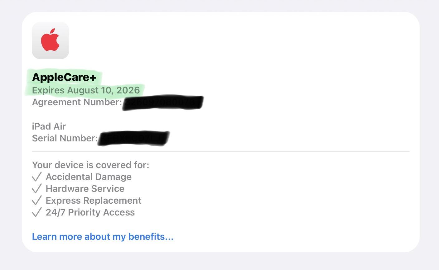 AppleCare+ is active and transferable through August 10, 2026.