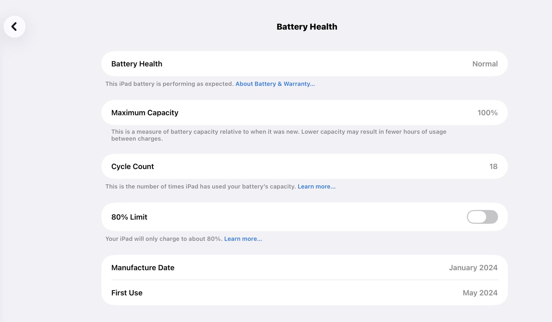 Battery health is 100% with only 18 charge cycles (see battery screen photo for verification). Battery performance is essentially like new.