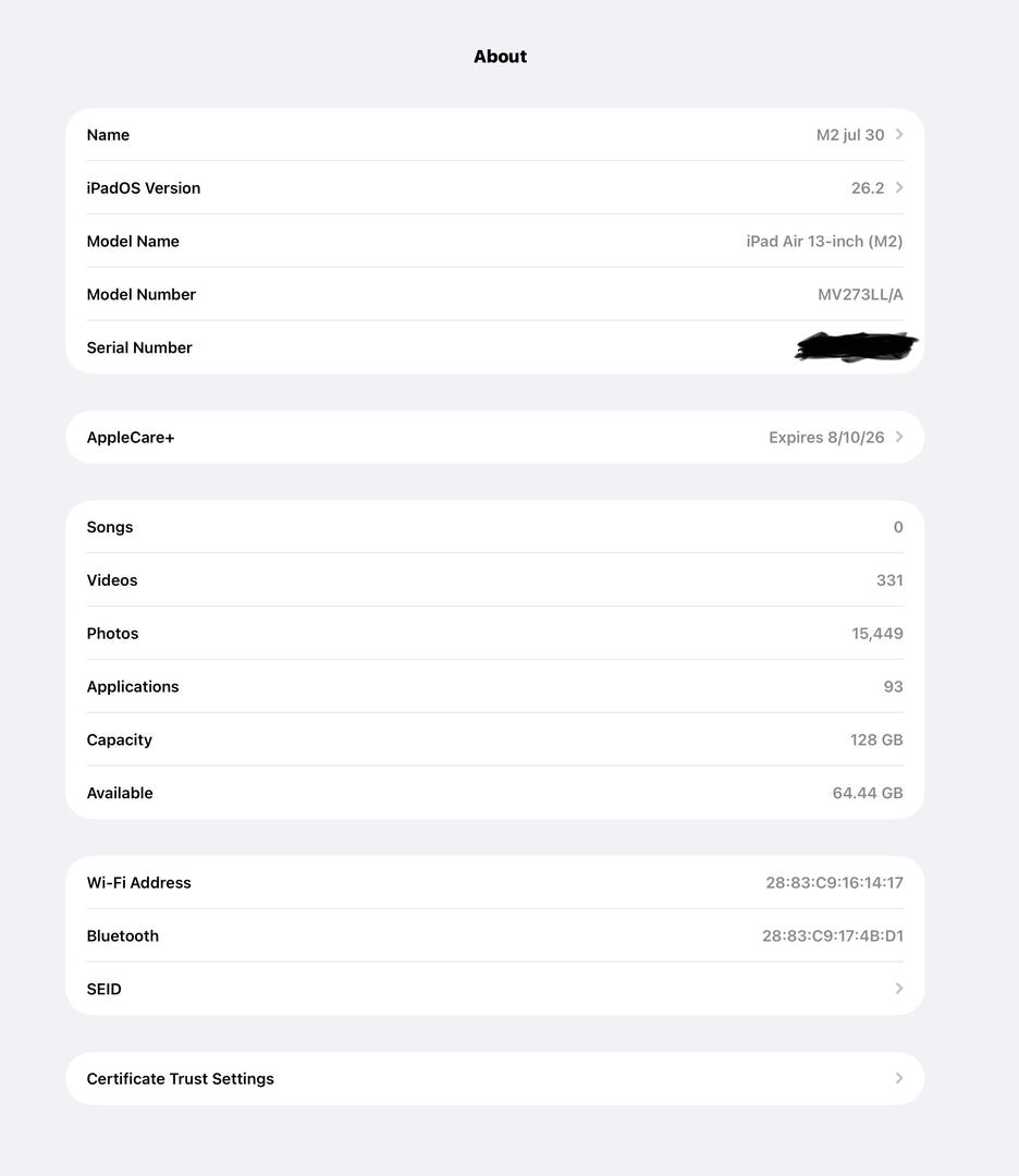 Mint iPad Air 13″ (M2) Wi-Fi 128GB — 🔋100% battery health, 18 charge cycles (see photo) — AppleCare+ active & transferable thru 8/10/26.