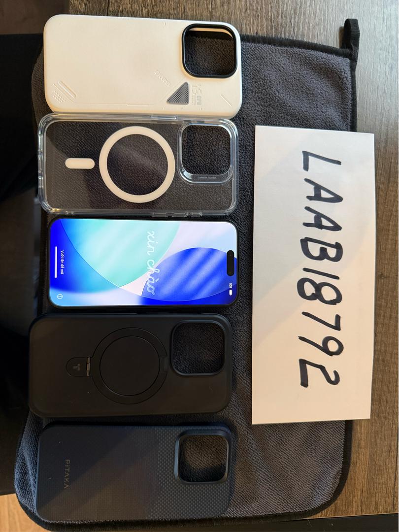 Selling an iPhone 15 Pro in Mint condition with 4 cases. This phone has no visible wear or tear and will come with 4 cases (Pitaka, Aulumu, Torraa, and a generic clear TPU case). The phone has a pre-installed screen protector already applied, but I do not have the original box for it. Battery health is 99%, and supply a screenshot for validation.