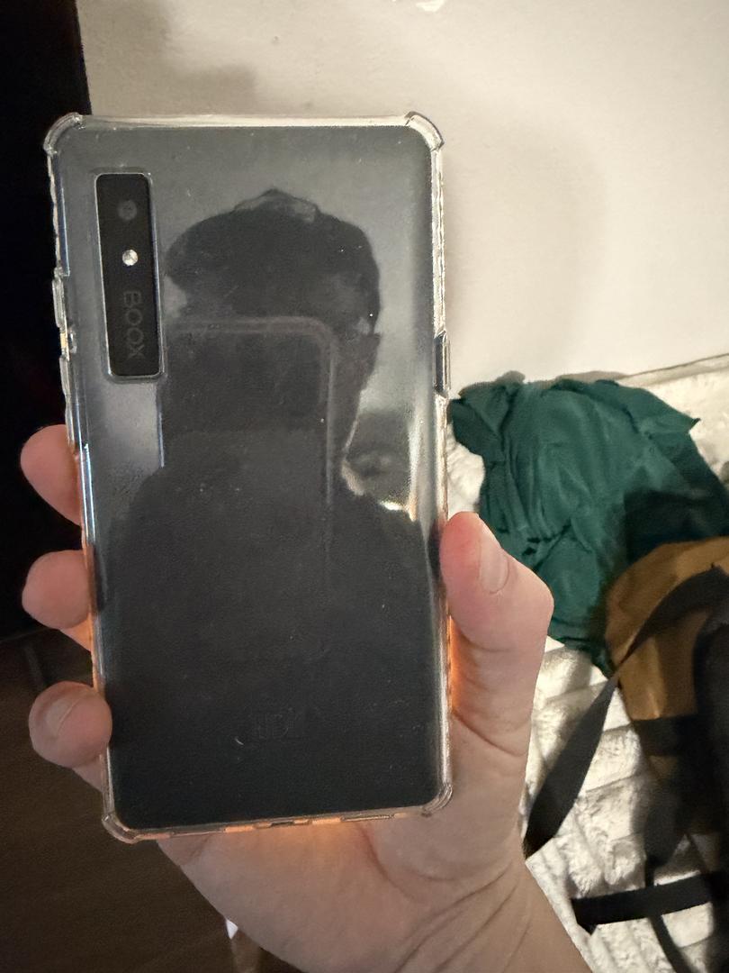 Mint Boox Palma with screen protector, clear case, and an extra folio case.
