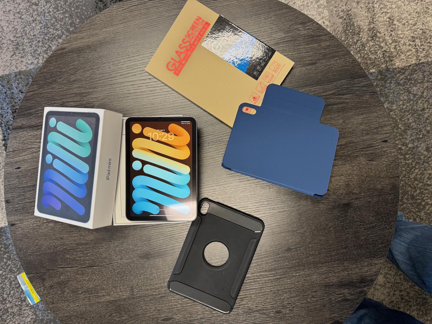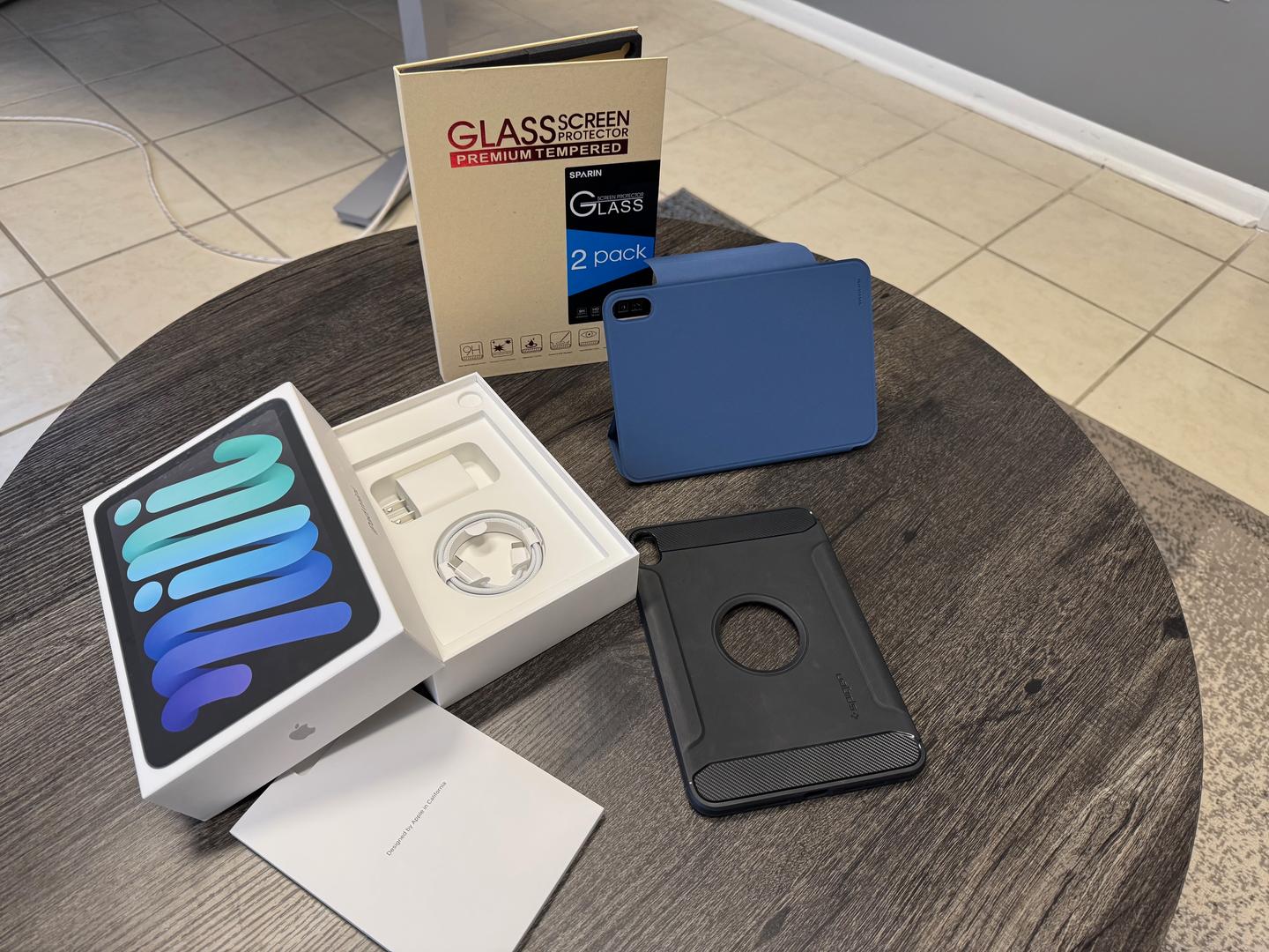Blue iPad mini in great condition! Includes original box, charging brick, USB C cable and Comes with a screen protector on it, two cases and an additional screen protector.