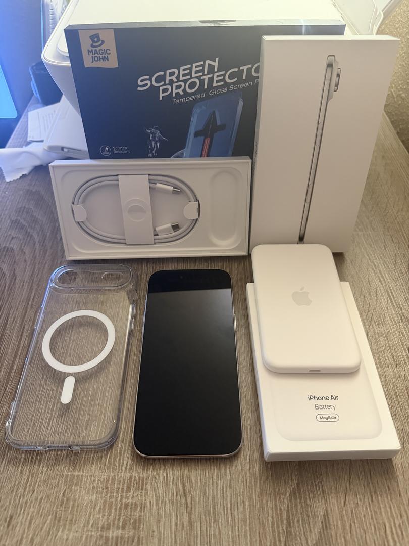 Selling white iPhone Air 256GB. Comes with original box and charging cable. Includes the iPhone Air MagSafe battery as well as 1 screen protector (not installed) and a clear Spigen MagSafe compatible case. Battery is at 100% health and has 59 cycle count. No signs of wear and tear or scratches. Any questions, please ask!