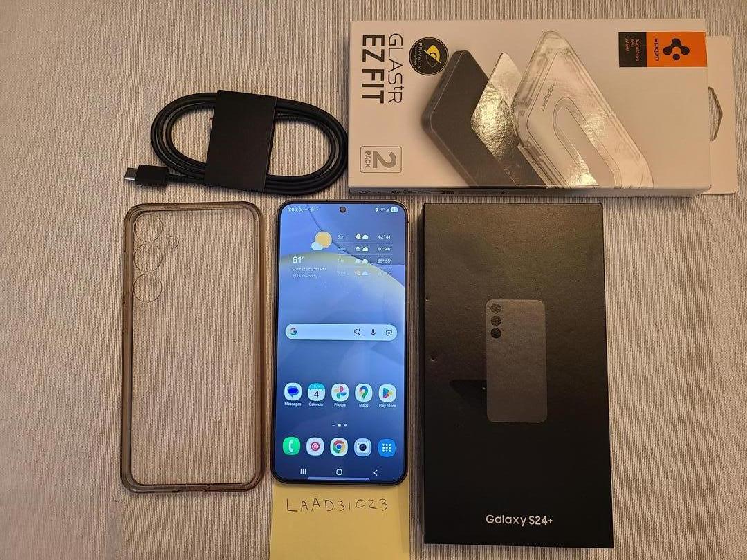 Very lightly used Galaxy S24 Plus. Color is officially "Onyx Black" but to me its more of a dark gray. Kept in a case and a screen protector from Day 1. Battery is still super strong and well maintained. No scratches or scuffs. I will include the original packaging and the unused original Samsung charging cable. I can throw in a clear case and an additional screen protector if interested. I can also perform a carrier unlock to run on other networks if that is preferred, but this is originally an AT&T branded phone.