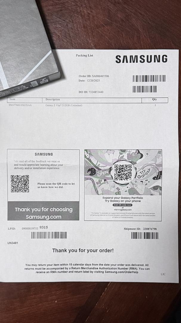 New in box unlocked Galaxy Z Flip 7. Clean IMEI. Won as a promotion.