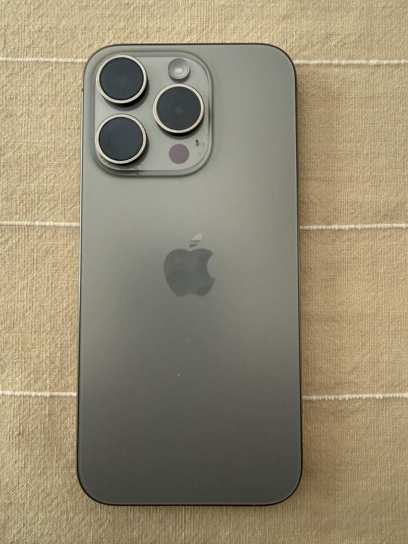 IPhone 15Pro includes Apple transparent case. 128GB storage. Charging cable (not original).