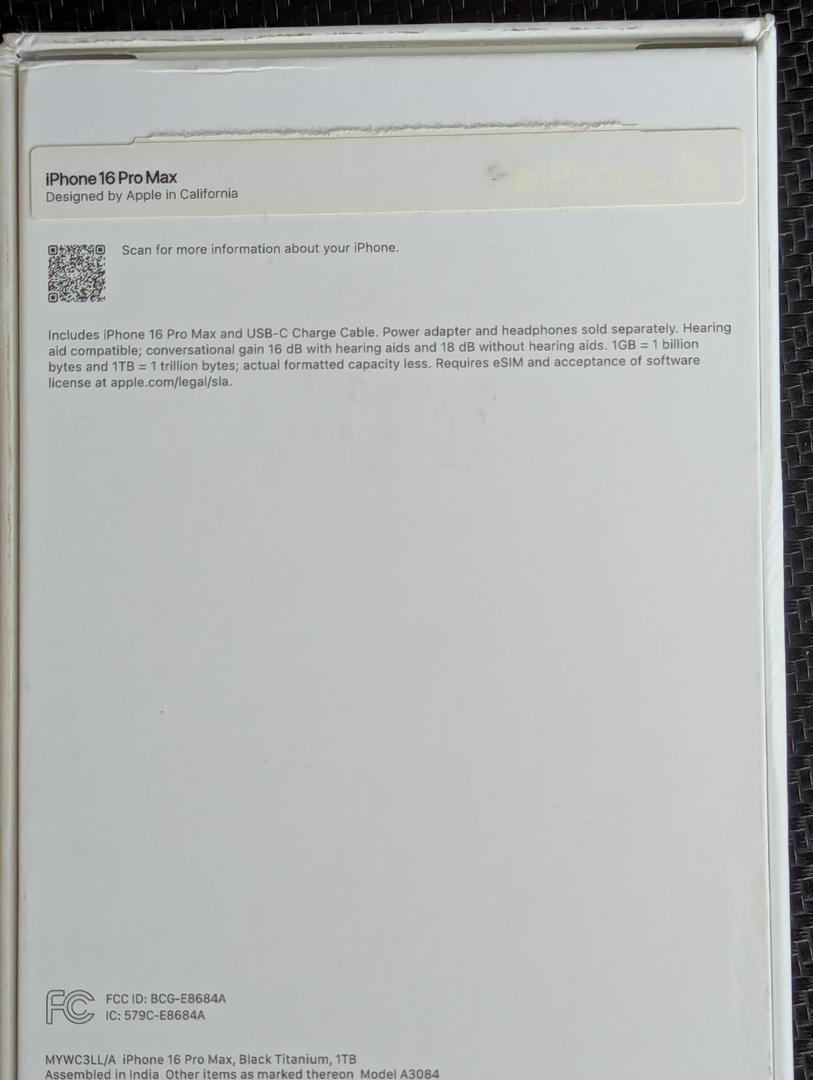 Apple iPhone 16 Pro Max 1TB Black Titanium in mint condition. Device was protected with a case during use along with ZAGG glass screen protector still currently installed. Battery health at 100% with cycle count at 46. USB cable not included.