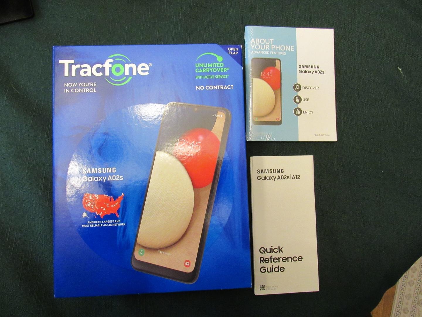 Includes Samsung Galaxy A02s Quick Reference Guide and Samsung Galaxy A02s About Your Phone Advanced Features.