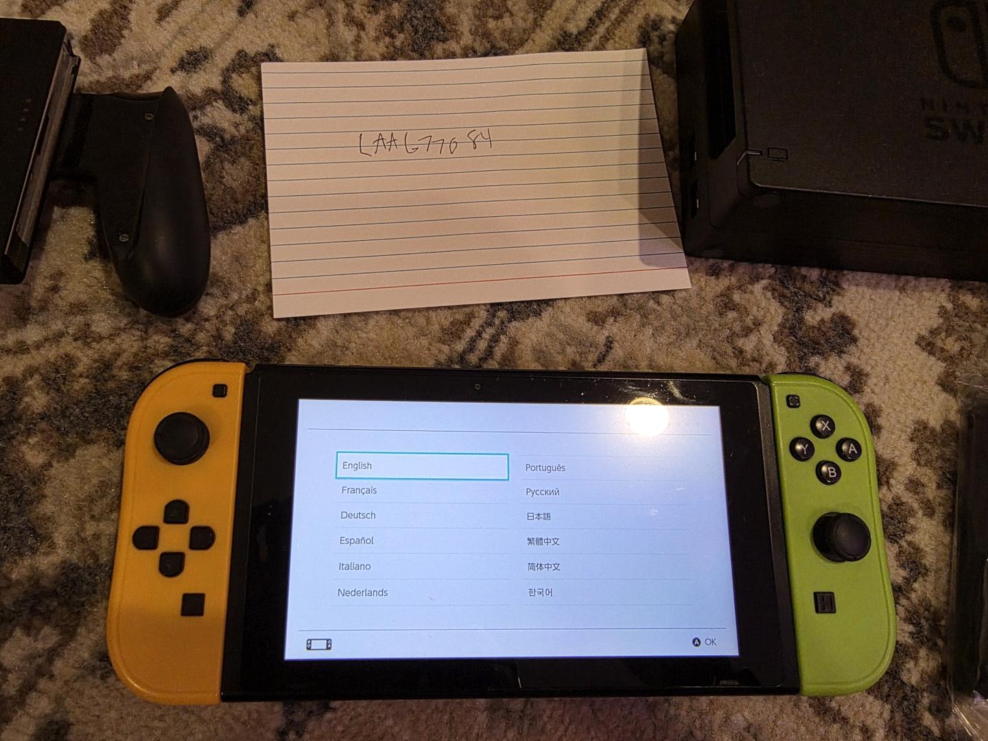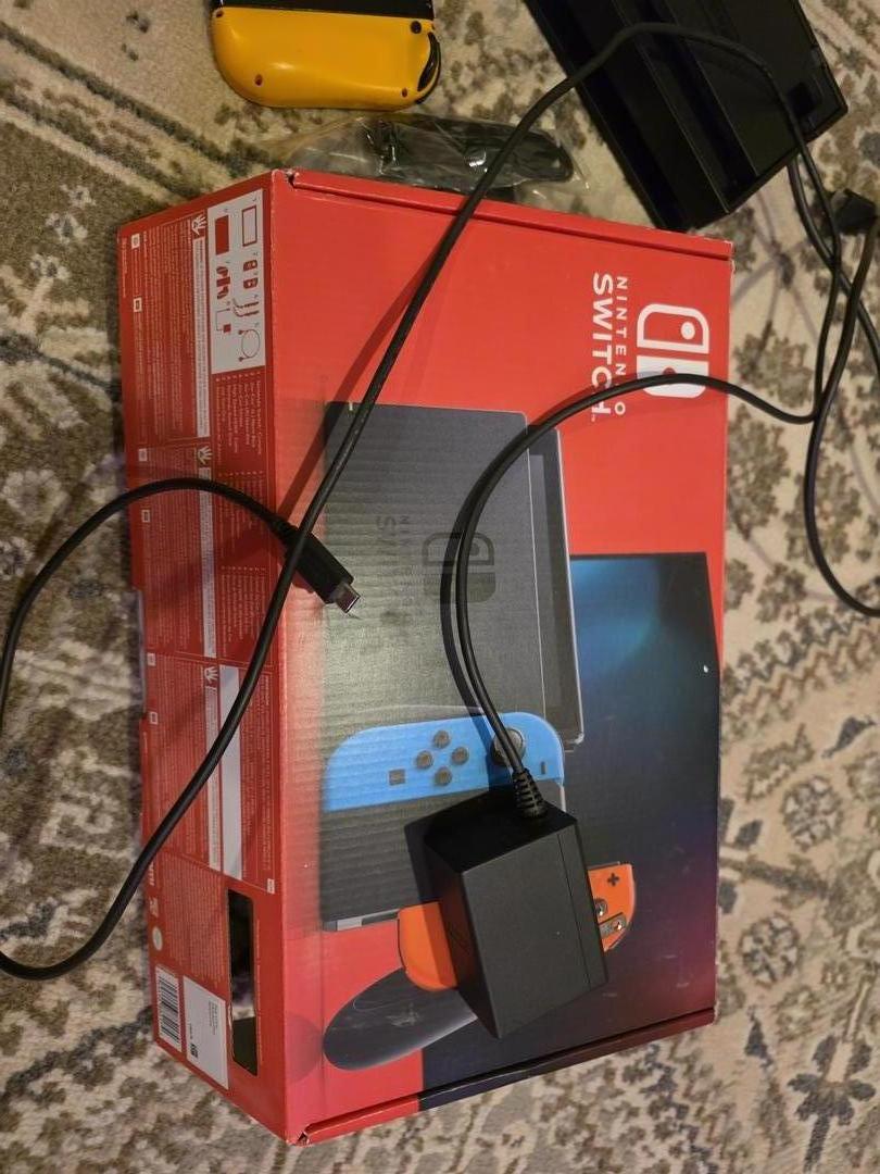 Nintendo Switch with box, charger, dock, joycon holder and wrist straps