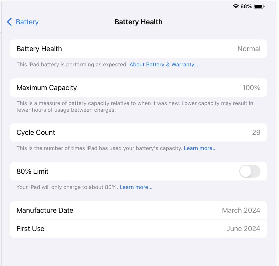 iPad Pro 13-inch (M4) Wi-Fi 256GB in mint condition. Battery health is 100% with only 29 charge cycles (details shown in Settings screenshot).