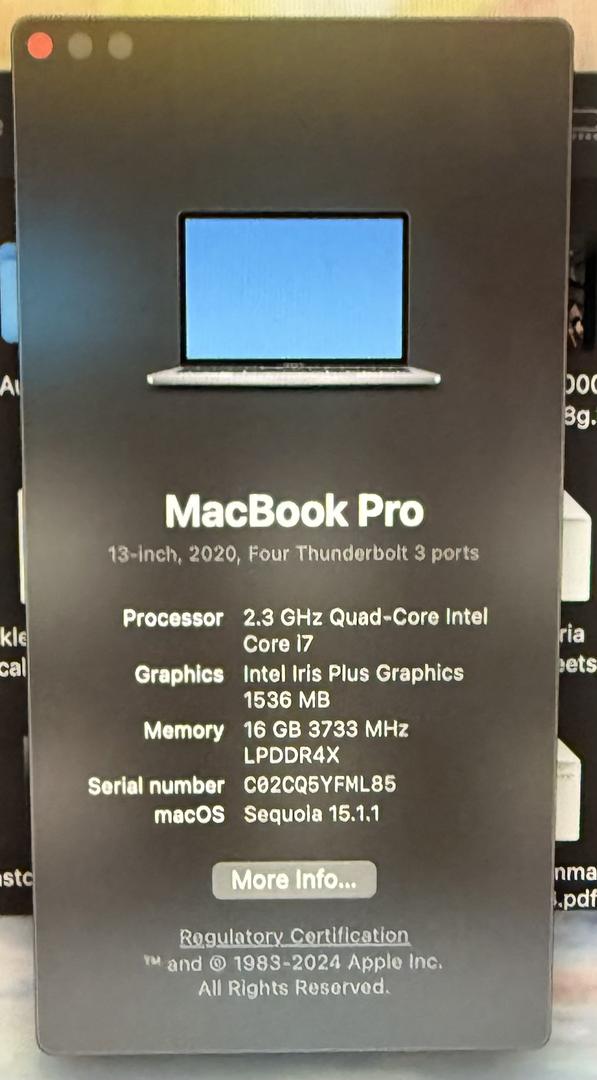 13-inch MacBook Pro purchased in 2020. This is the higher-end Intel i7 model with 16GB of RAM, 512GB SSD, and four Thunderbolt ports.