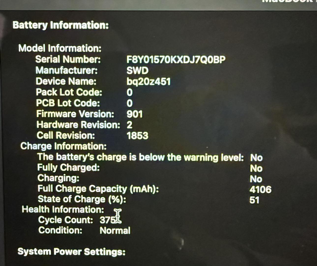 The laptop is in great working condition and has been well cared for. Battery is in normal condition with ~375 cycles, well below Apple’s rated lifespan. No system, power, or thermal warnings. Fan operates normally and ramps under heavier workloads as expected for Intel MacBook Pros.