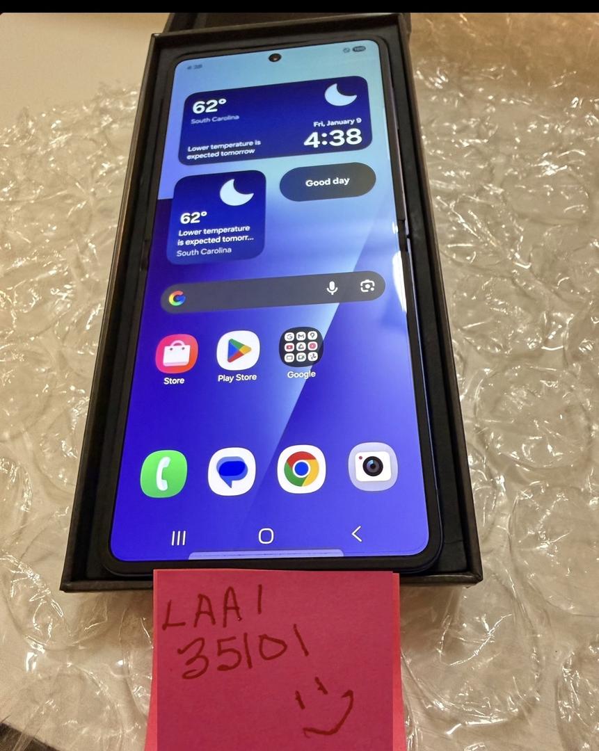 AT&T, but unlocked to be used on any carrier. Samsung Z flip 7, blue, 256gb, comes with a case, original box, sim tray key, does not have charging cable.