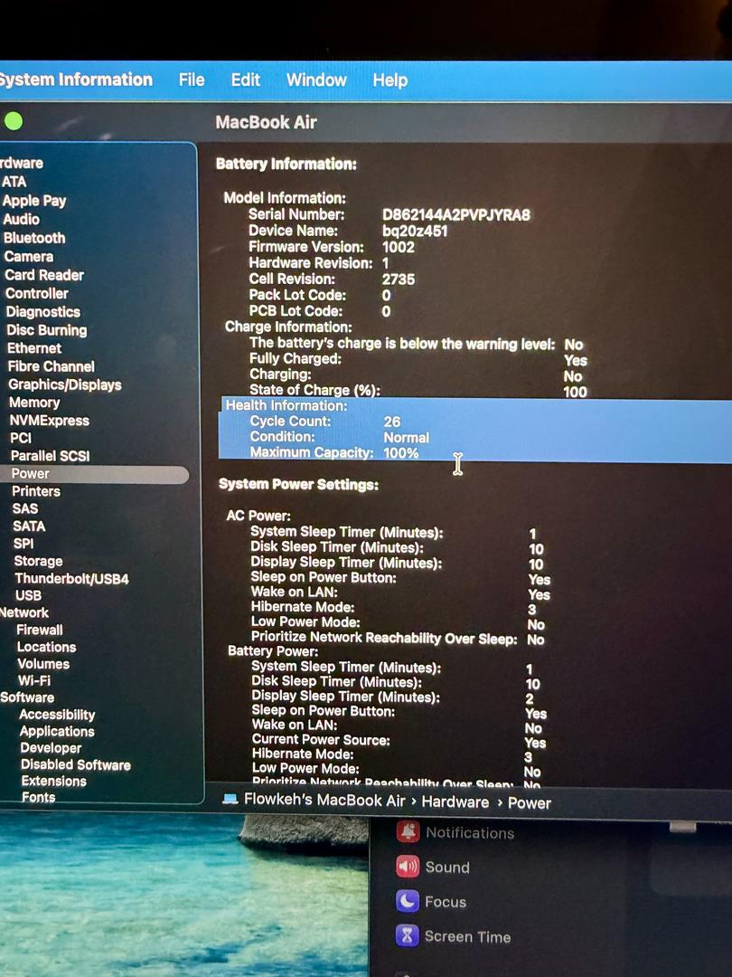 100% battery health, only 26 cycles (original battery, never replaced)