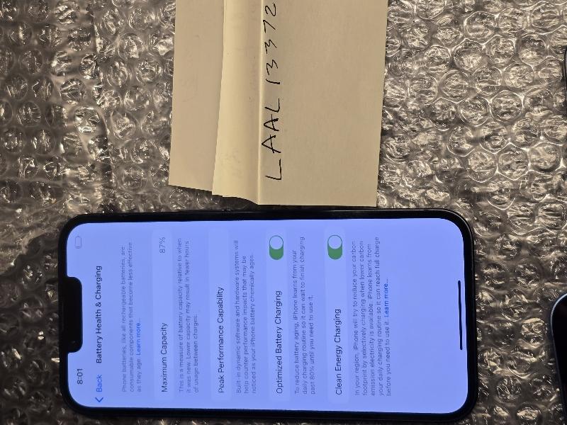 iPhone 14 128 GB Black in Near Mint Condition, Tiny scratches on screen, back, and sides. Damage is pictured and purely cosmetic. Battery health is 87%, unlocked for use with any carrier. IMEI is clean and ready for activation. Kept well in screen protector and case.