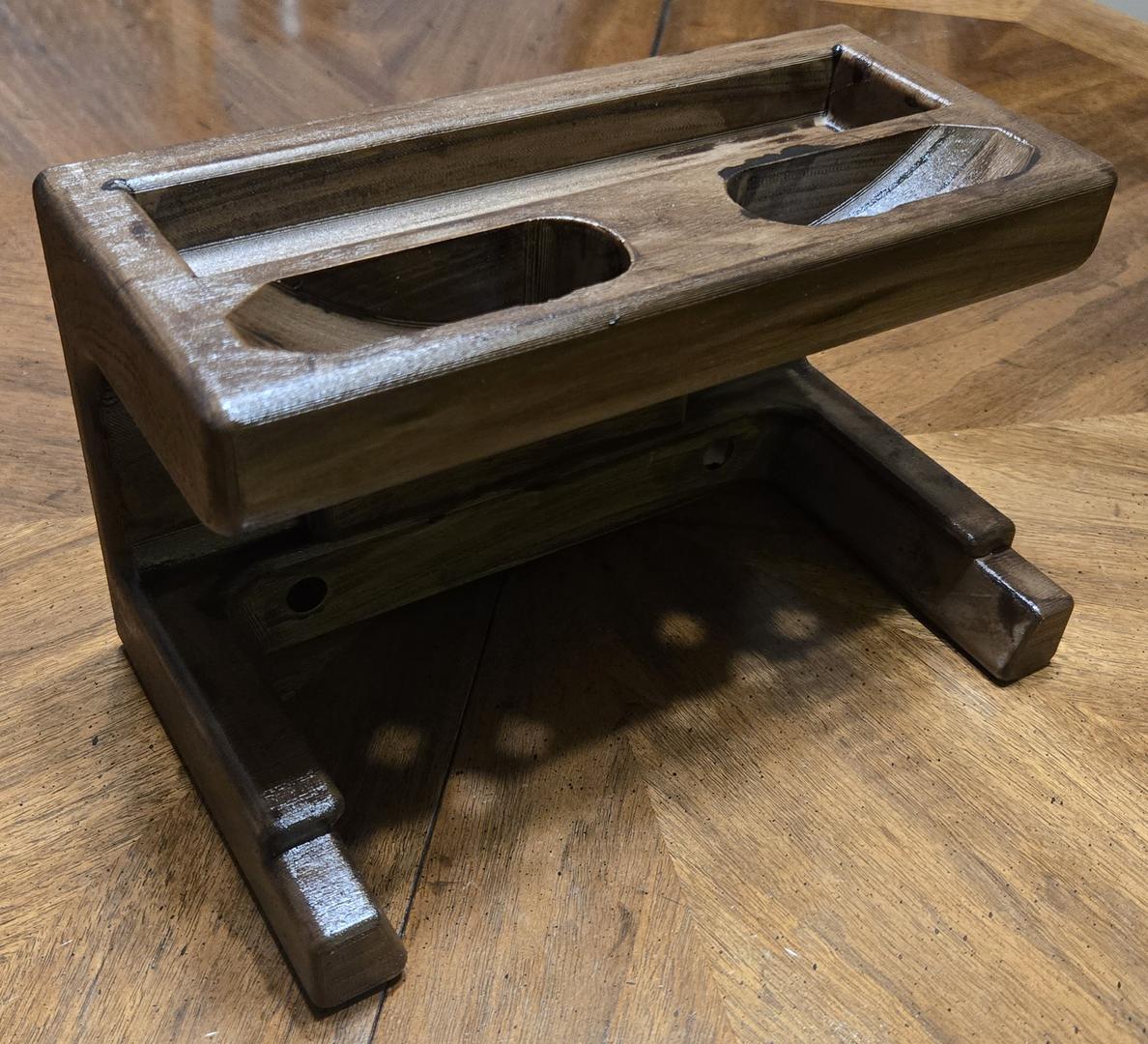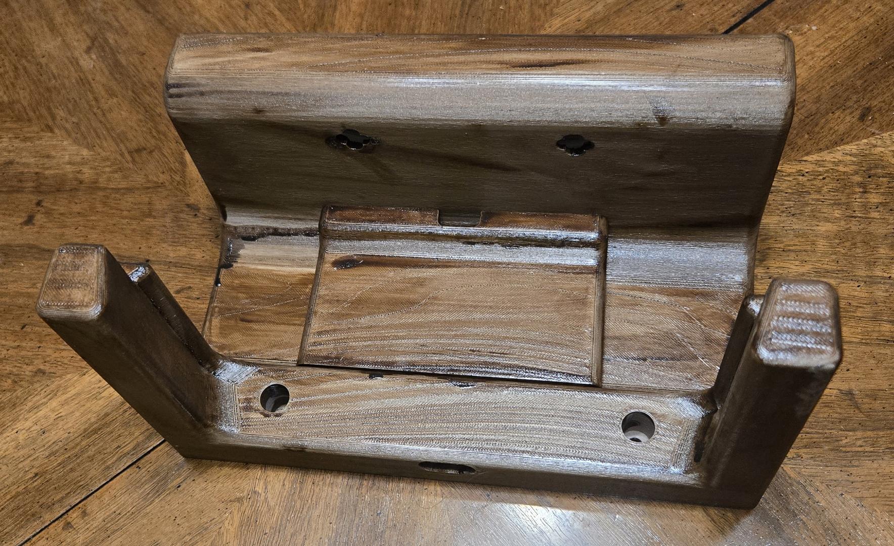 3D Printed, Wood-Stained, Wall-Mountable Headset and Controller Stand (design by Nuehado @ https://www.thingiverse.com/thing:3976286)