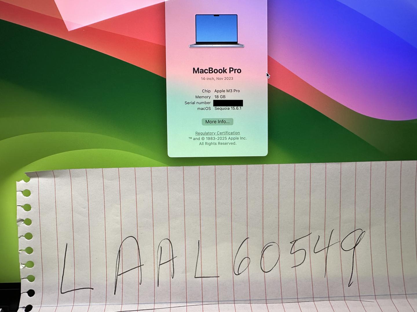 MacBook Pro 14″ Late 2023 with Apple M3 chip, 18GB unified memory, and 512GB SSD.