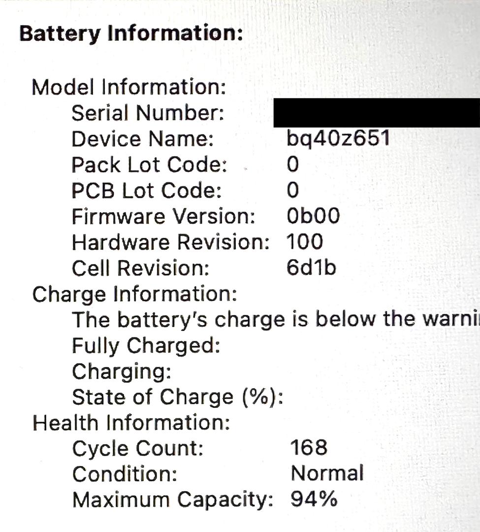 Very clean, adult-owned machine in excellent working condition. No functional issues. Battery cycle count approximately 168 (normal/healthy).