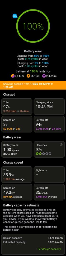Battery life is great at 85% of original capacity, see screenshot from full capacity test.