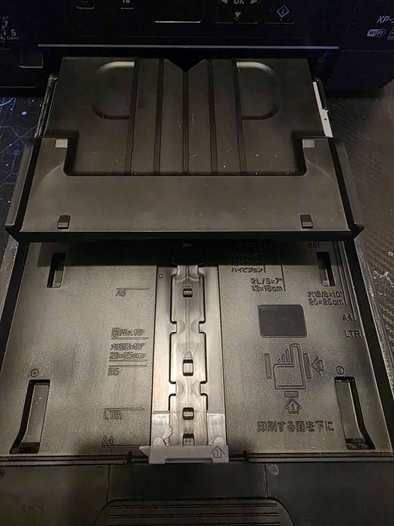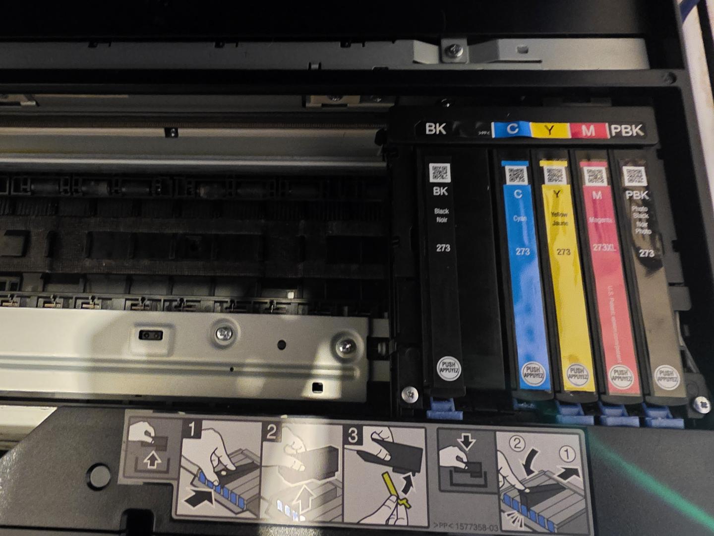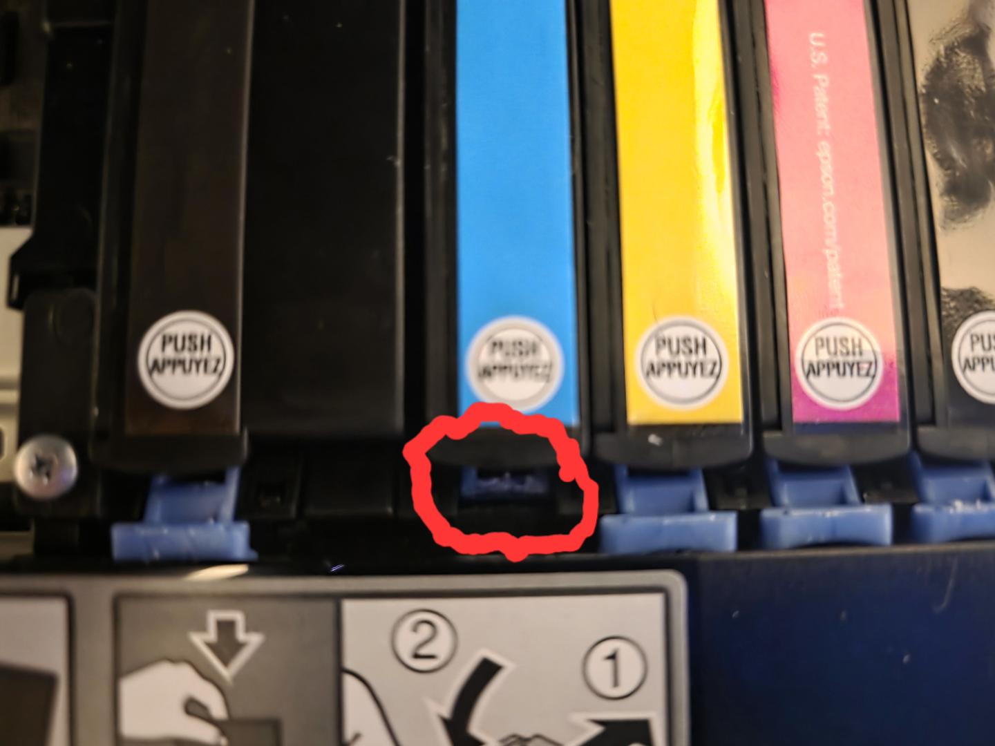 The only issue with this printer is the little blue piece you push to eject the cartridge for the cyan color is a little broken, (I circled it in red) long nails or scissors pops it out just fine.