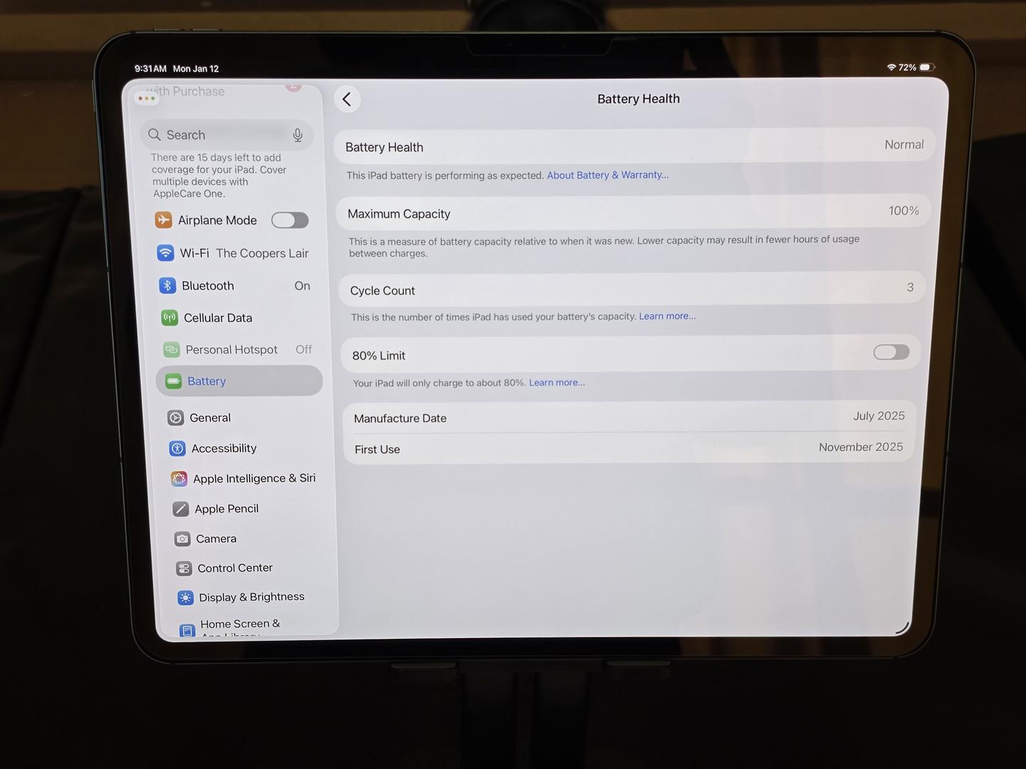 IPad is in Excellent Condition (Like New). IPad was rarely used. Battery Health is Normal with only 3 cylcle counts and maximum capacity of 100%. All original power adapter and cable included and unused. Tablet has screen protector on it plus Torras case for protection. ESR Keyboard Case is like new.