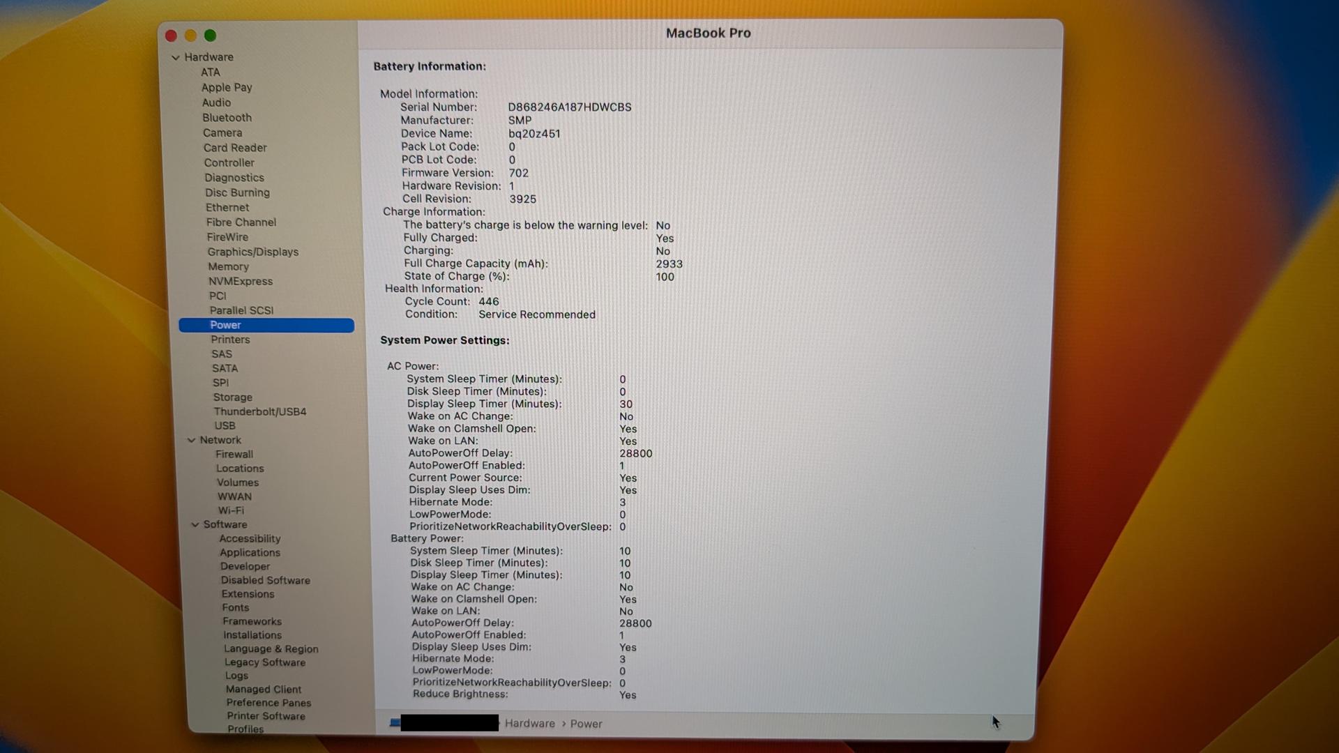 - Battery cycle count at 446 and in "service recommended" condition; lasts 1-3 hours depending on usage