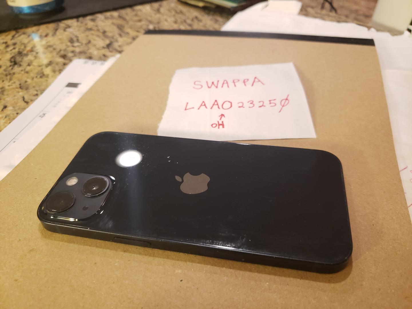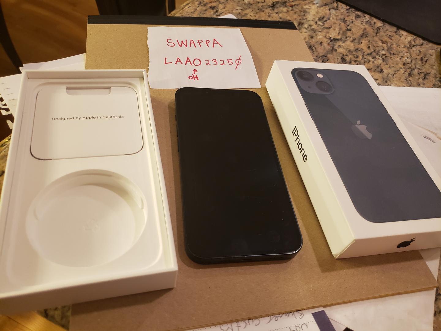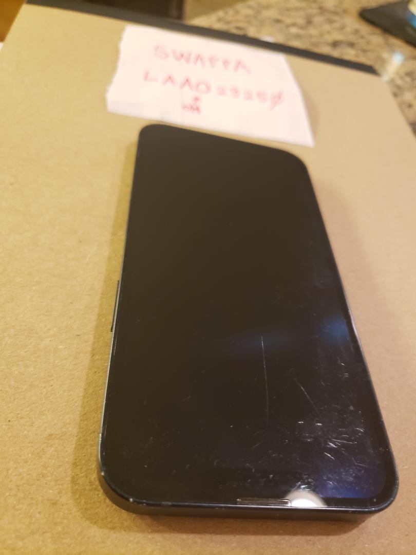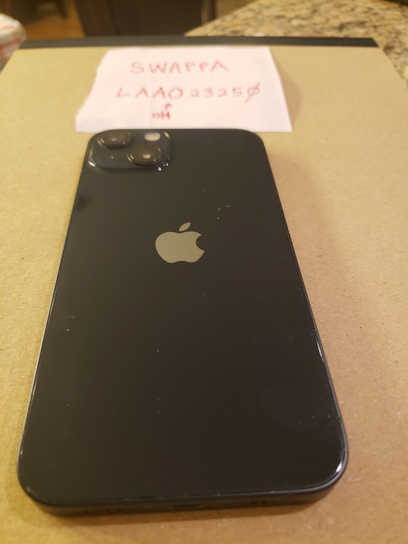 iPhone 13, unlocked, 128Gb, black. Includes original box, but box is from a different iPhone 13. Does not include a cable or charger.