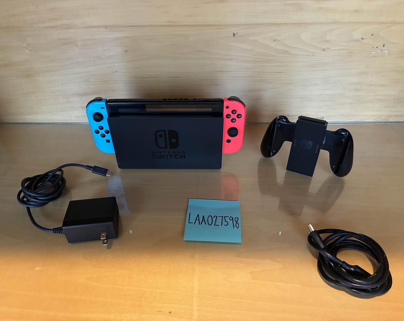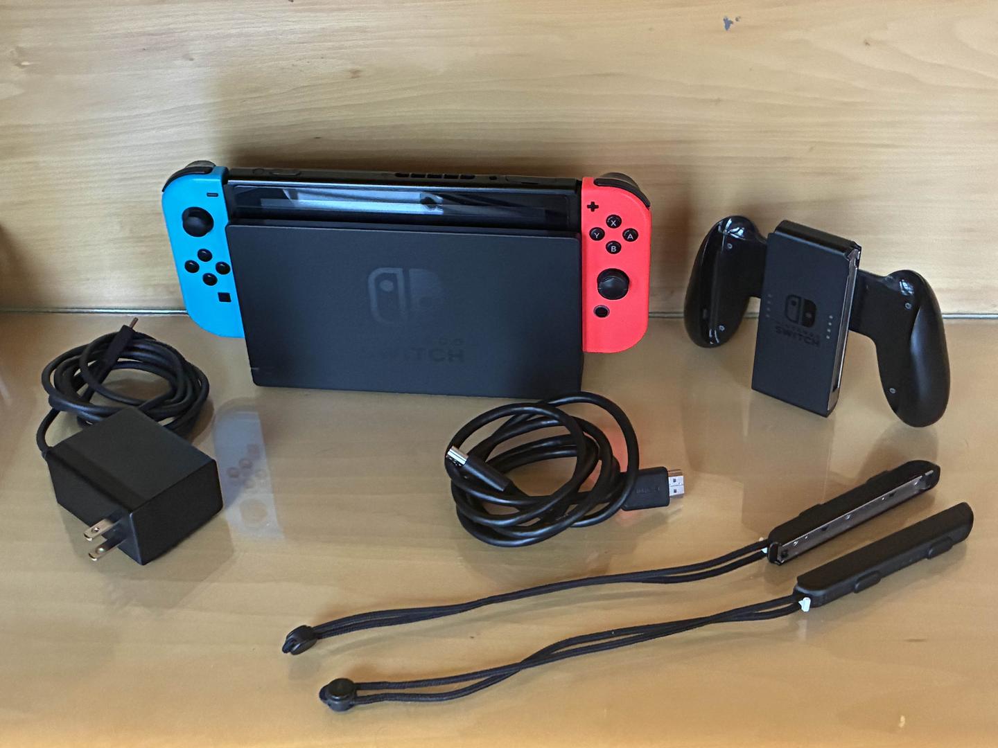 Used v2 model of the Nintendo Switch. Comes with Nintendo Switch console, dock, neon blue and red joycons, joycon grip, joycon straps, and hdmi and ac cables.