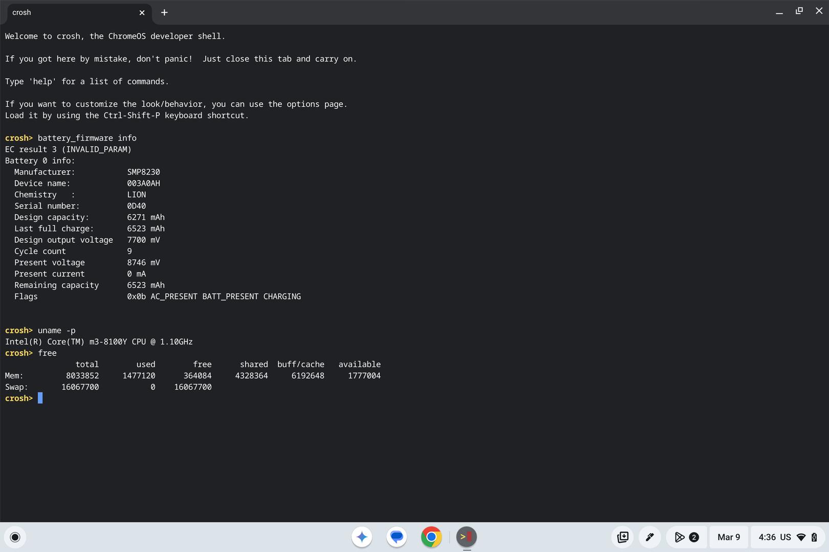 Battery has only 09 cycles which indicates the battery has been used approximately few days after out of the box. Battery health is perfect at 100%. Serial number: 0D40. Battery count is the same as mileages of a car; based on the count, you can make an educated guess how long it has been used. Be aware of buying a Pixel Slate without information of battery as you may buy one that reaches the end of its life such as over 300 battery cycles.