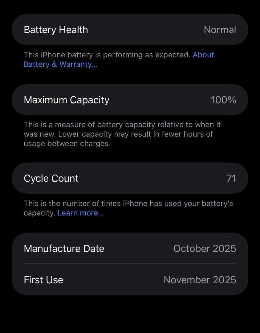 The battery is listed as having 100% health, but how many charge cycles does it have?