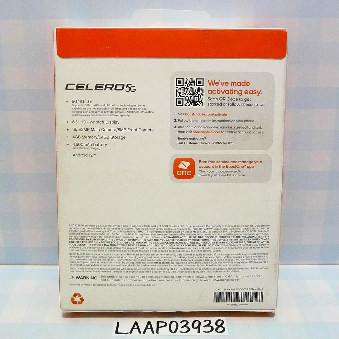 Boost Mobile Celero 5G 2.0 Phone (2023)|6.5" HD+|Android 12|4GB RAM|64GB Storage|Color: Gray